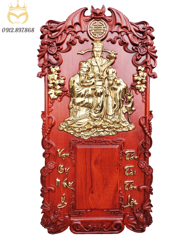 Quy cách | Đục nổi hình 3 ông Tam Đa trên tấm gỗ nguyên khối, câu đối "Vạn sự như ý - Tấn tài tấn lộc". Hoa văn họa tiết hình hình chú Rơi đang cắp đồng tiền. |