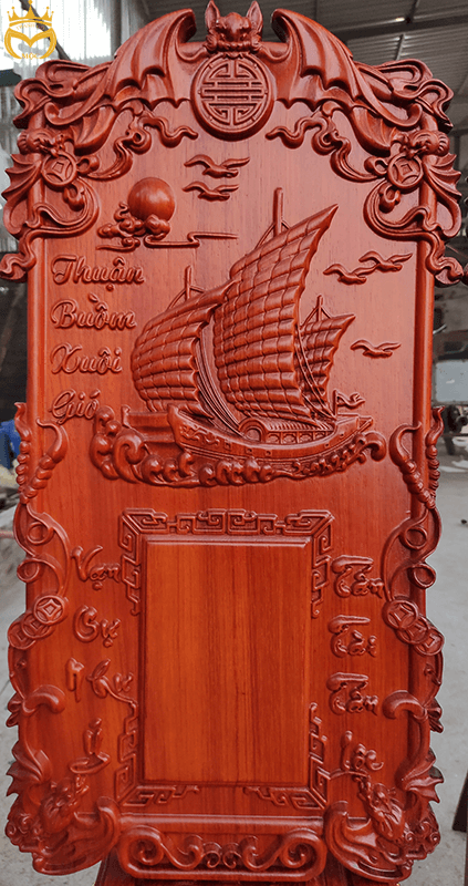 Quy cách | Đục nổi hình Thuận Buồm Xuôi Gió trên tấm gỗ nguyên khối, câu đối "Vạn sự như ý - Tấn tài tấn lộc". Hoa văn họa tiết hình hình chú Rơi đang cắp đồng tiền. |