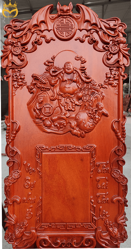 Quy cách | Đục nổi hình phật Di Lặc trên tấm gỗ nguyên khối, câu đối "Vạn sự như ý - Tấn tài tấn lộc". Hoa văn họa tiết hình hình chú Rơi đang cắp đồng tiền. |